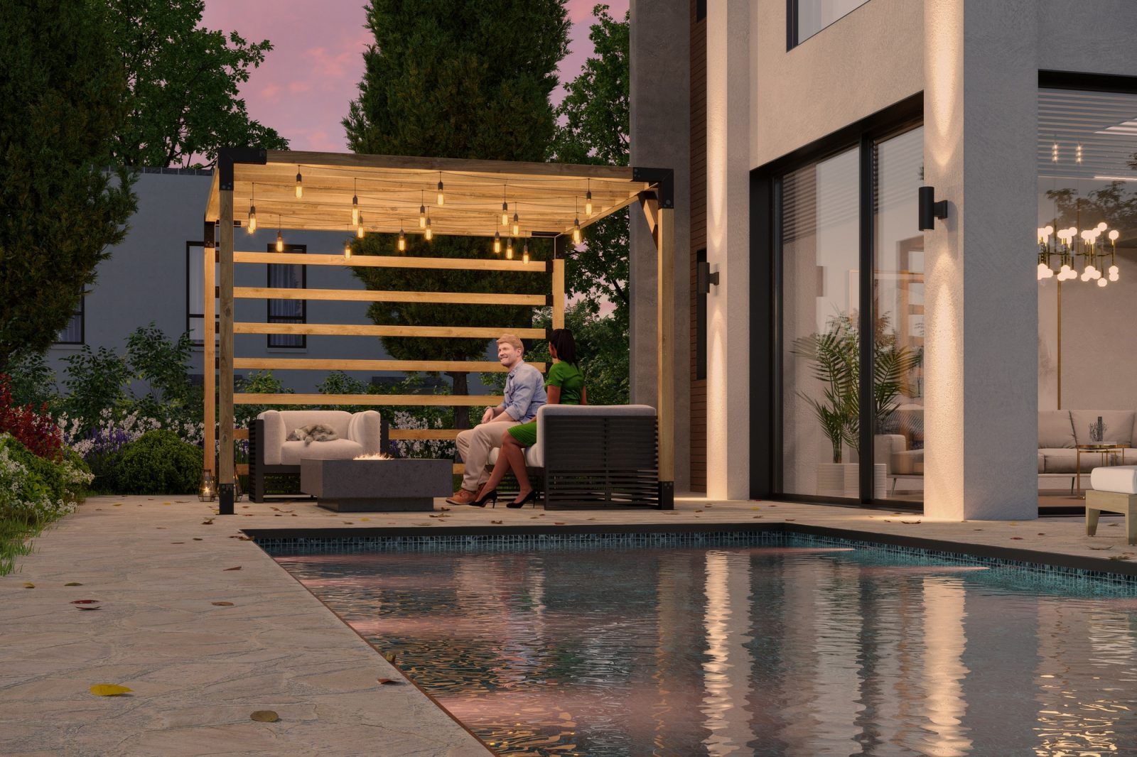 The second step was to place the pergola in a specified environment to show how it would fit into the house’s exterior. An individual exterior in a style that was complimentary to the pergola’s design has been created. Pergola has to be a central product in the visualization, and a modern house, proper angles, and lighting have been chosen and created to show it most attractively.